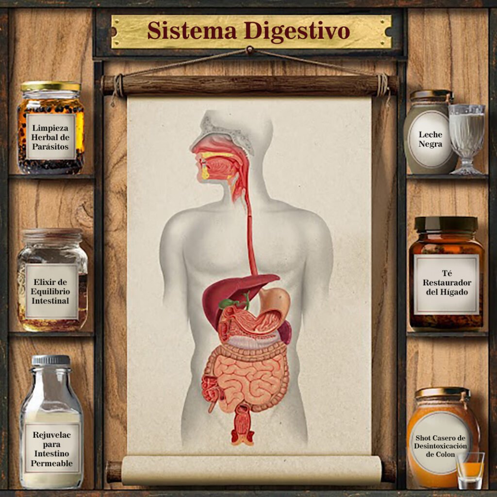 Digamos que atrapaste un gusano parásito que quieres eliminar. Vas al Estante del Sistema Digestivo… y buscas algunas recetas que ayuden a lidiar con esto. ¡Anti-Parásitos de Nuez Negra suena como una buena idea!